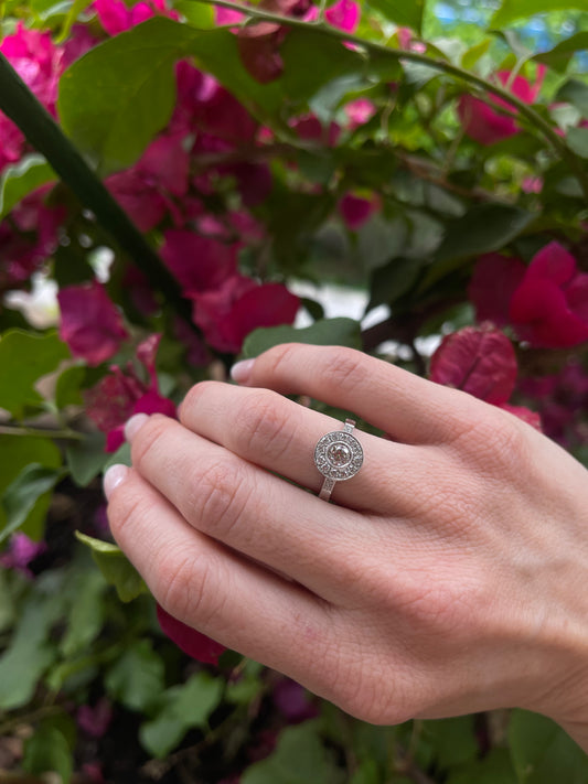 Anillo modelo halo, oro blanco con baño de rodio y brillantes
