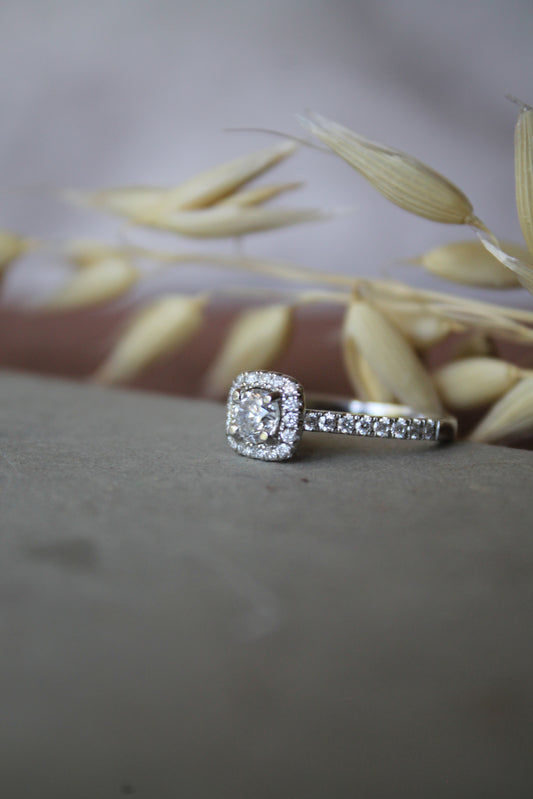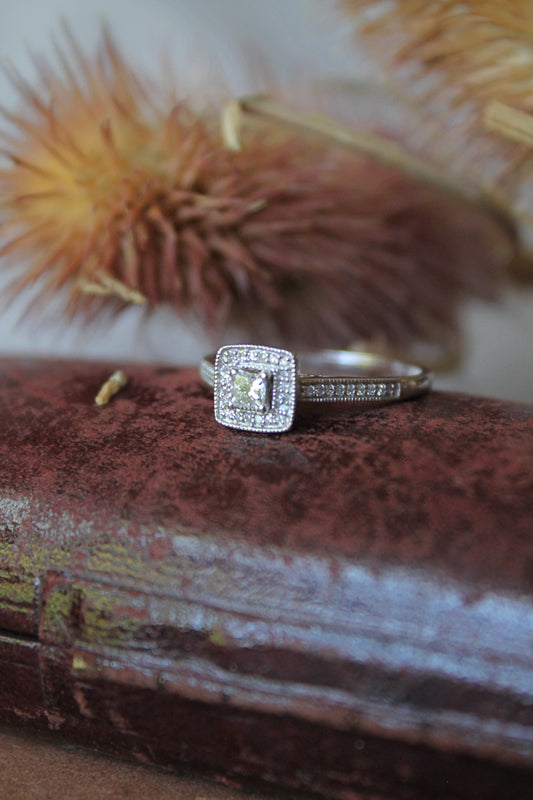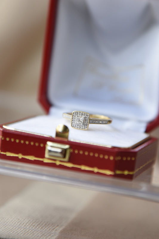 Anillo modelo halo cuadrado, oro amarillo y brillantes