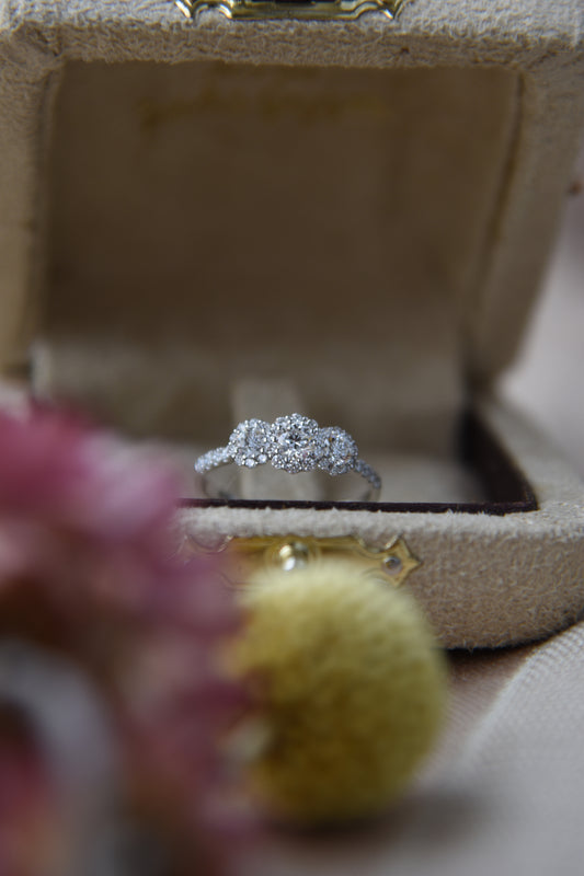 Anillo triple halo, oro blanco, zafiro y brillantes
