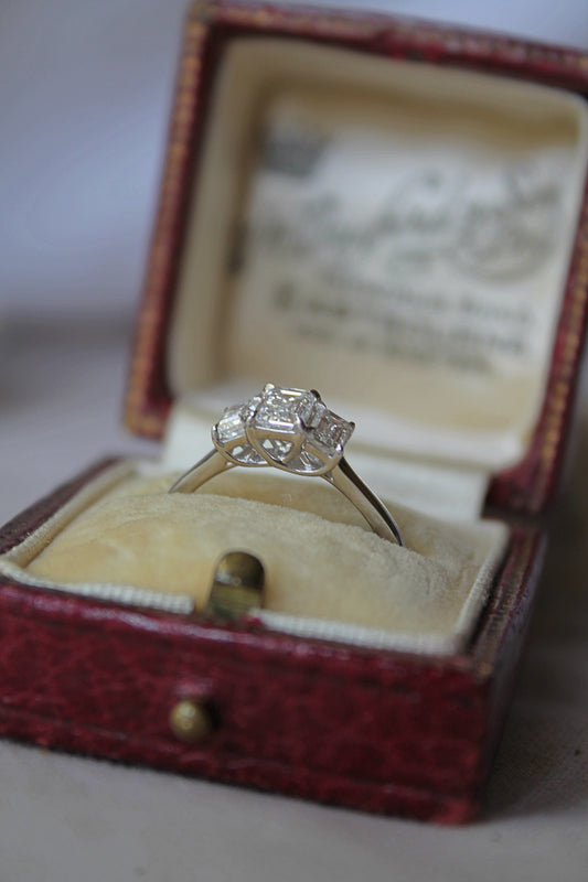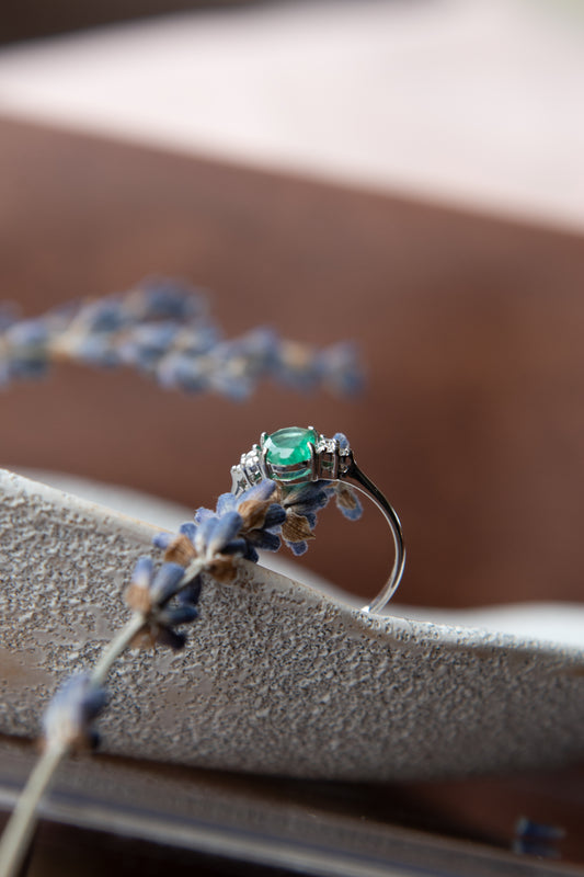 Anillo modelo tricillo, oro blanco, esmeraldas y brillantes