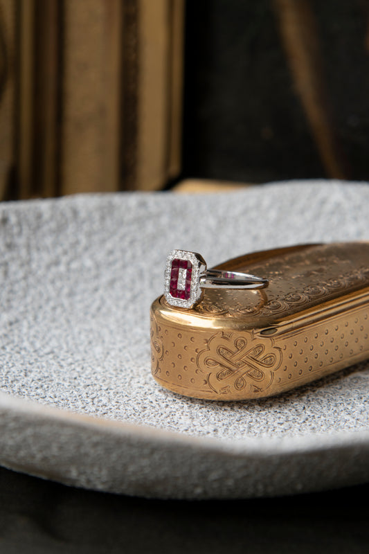 Anillo modelo halo, oro blanco, rubí y brillantes