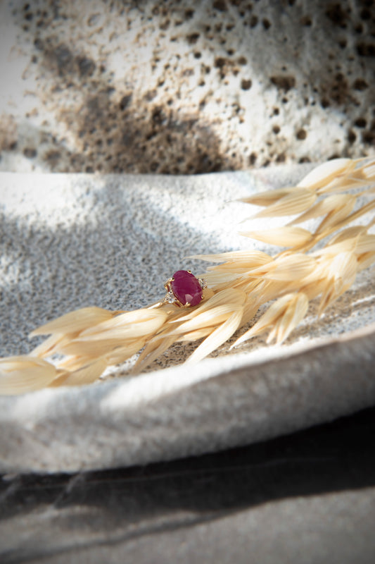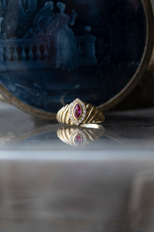 Anillo modelo octogonal, metal oro amarillo, brillantes y rubí