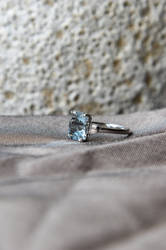Anillo oro blanco, con baño de rodio, aguamarina y diamantes talla trapecio