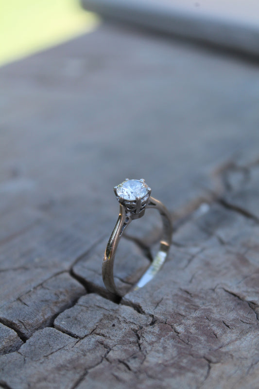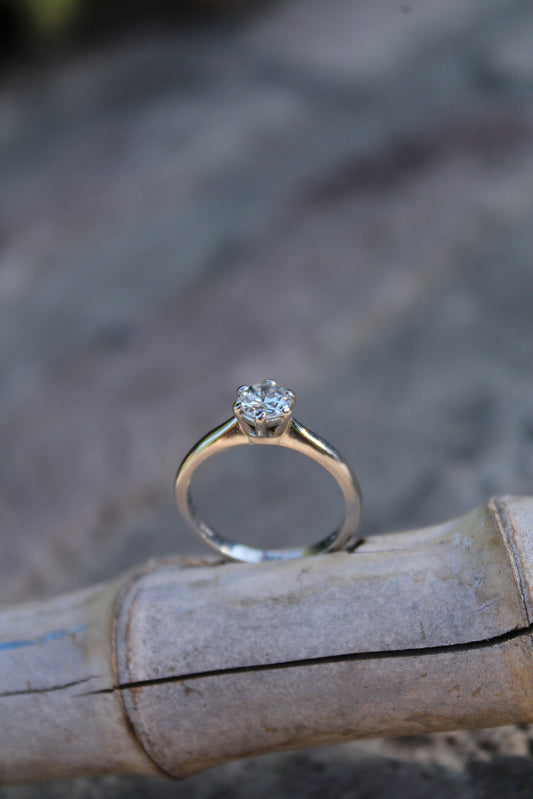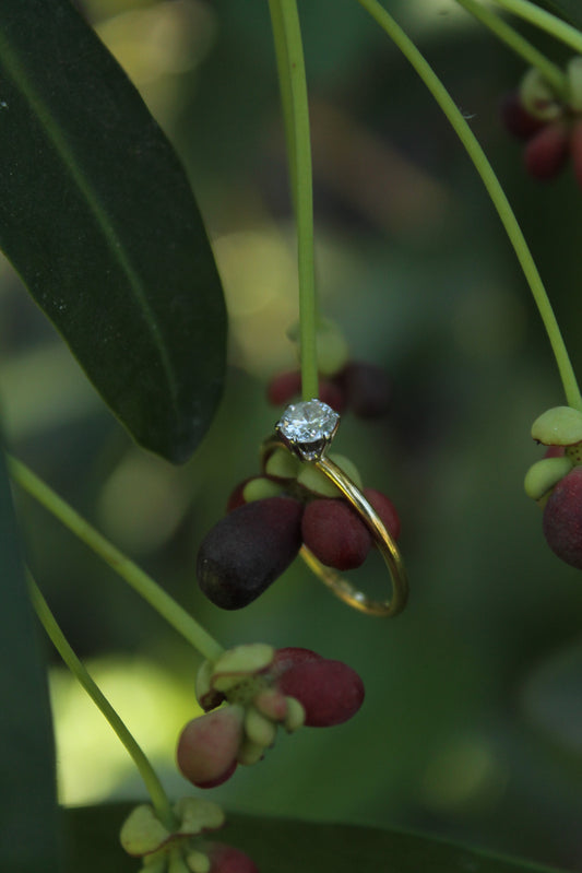 Anillo solitario europeo, hecho a mano, metal platino y oro amarillo. Diamante "old european cut"
