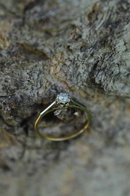 Anillo solitario europeo, oro amarillo, platino y brillante "old european cut"