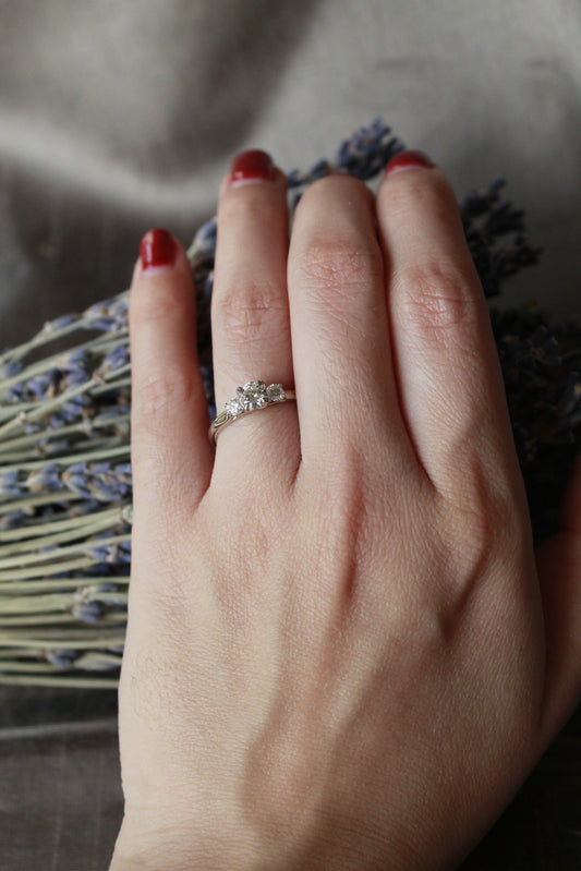 Solitario estilo antique, hecho a mano, de oro blanco italiano y brillantes