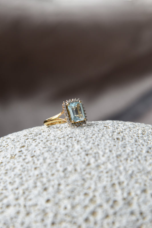 Anillo modelo halo octogonal, oro amarillo, aguamarina y brillantes