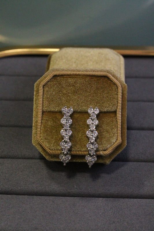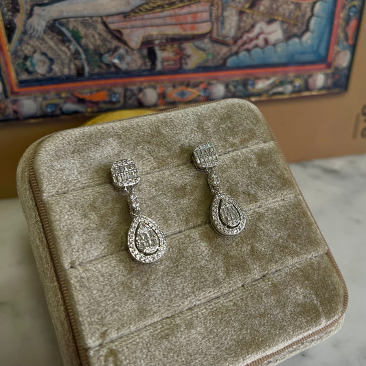 Aros fancy largos, plata fina 925 y zirconitas talla baguette y brillante.