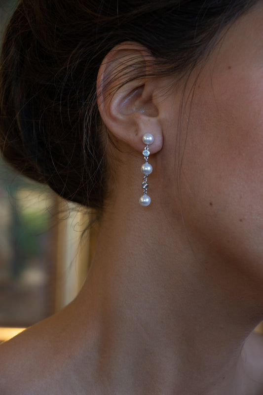 Aros largos gotas, plata 925, zirconitas y perlas sintéticas.