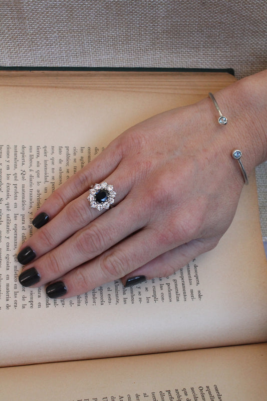 Anillo modelo Lady Di, hecho a mano en Inglaterra, Platino, zafiro y brillantes.