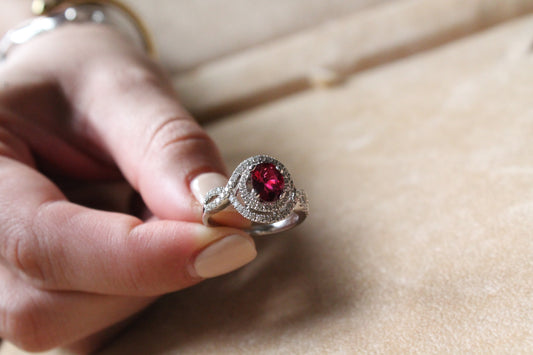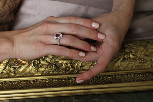 Anillo europeo, hecho a mano, oro blanco italiano, brillantes y rubí (Rubí Africano, con certificado).