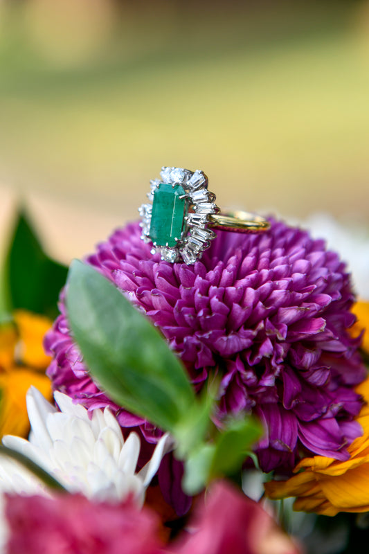 Anillo europeo modelo "cóctel", hecho a mano. Oro amarillo, platino, diamantes talla brillante y baguette