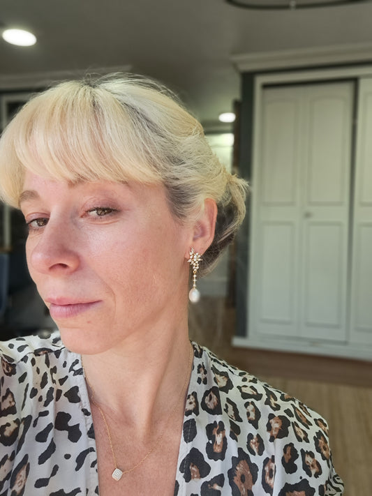 Aros reina largos, plata 925 con enchapado en oro amarillo, perlas de agua dulce y zirconitas