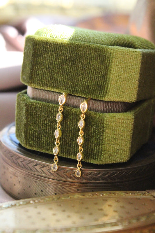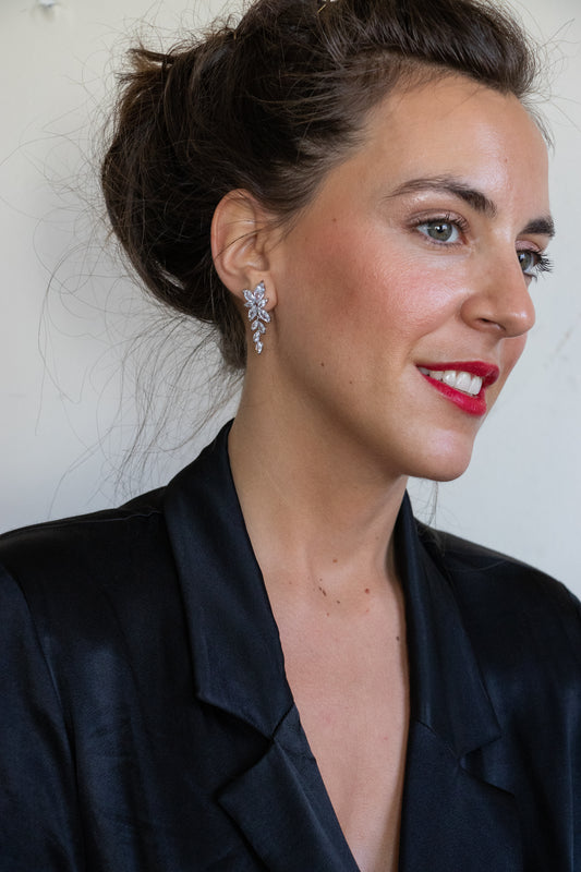Aros largos hojas, plata 925 y zirconitas incoloras talla marquesa