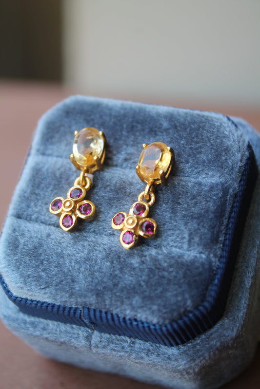 Aros metal plata 925 enchapada en oro, cuarzo citrino y granates