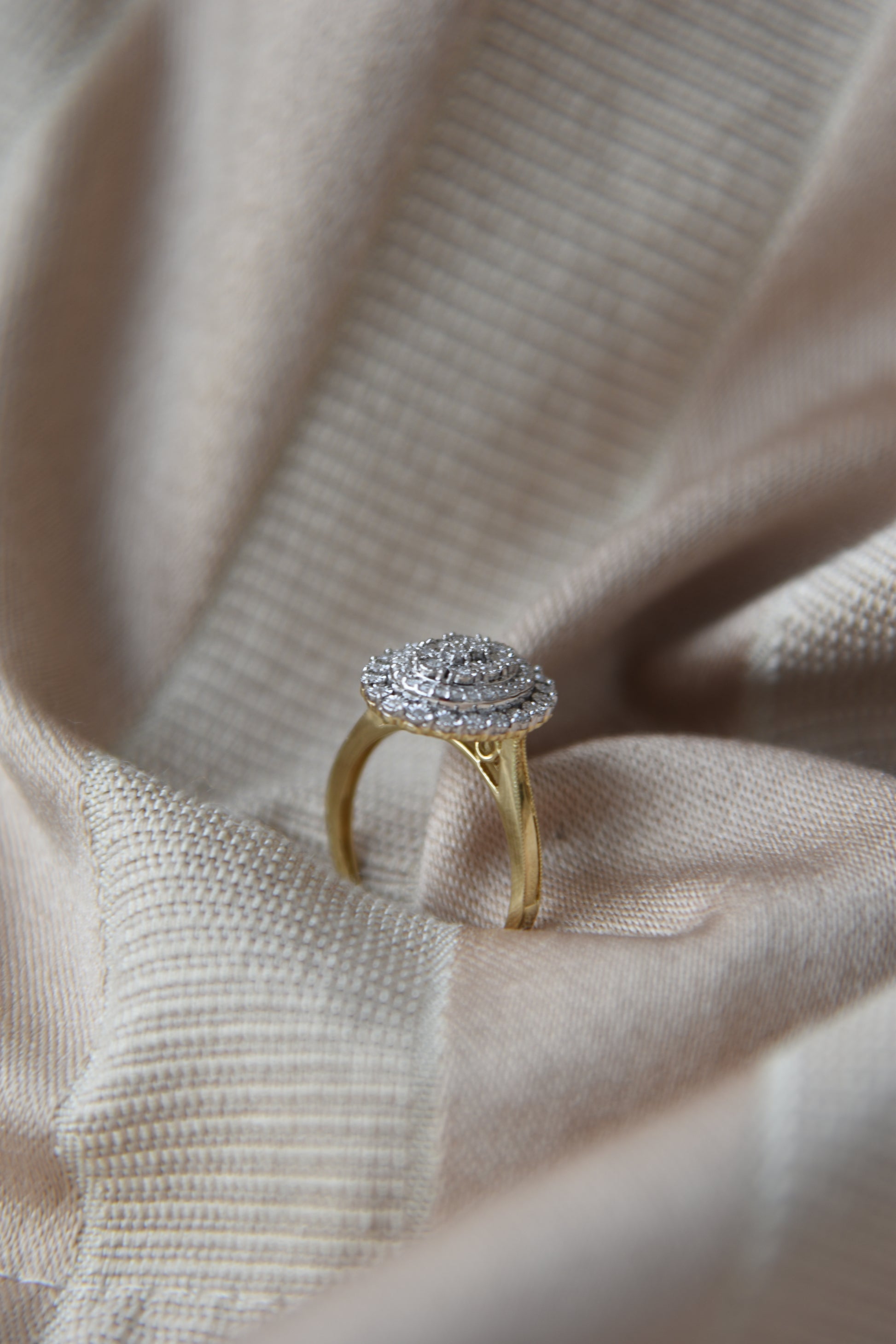 Anillo modelo triple halo, oro amarillo, oro blanco y brillantes