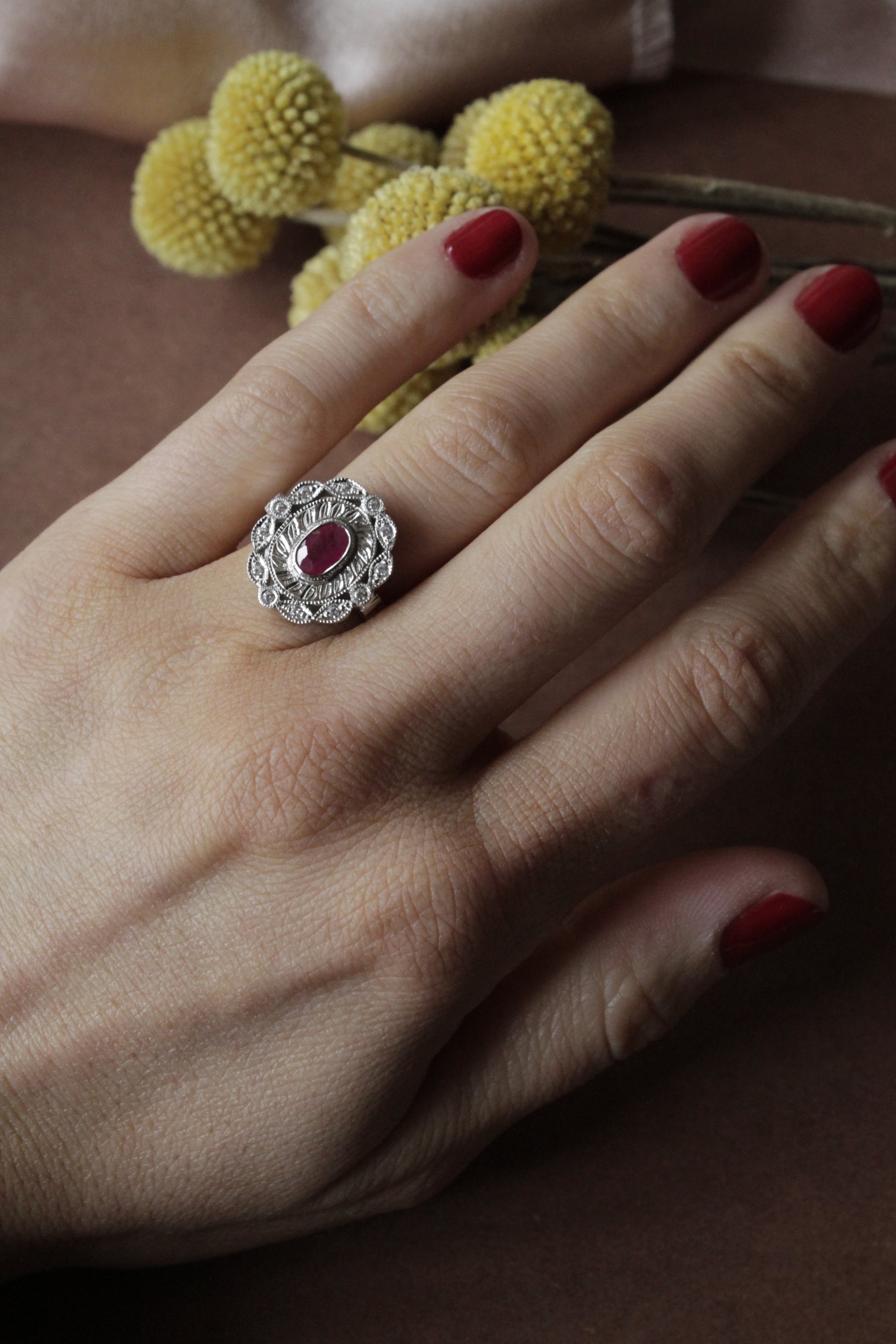 Anillo diseño floral, hecho a mano, plata 925 y Rubí natural