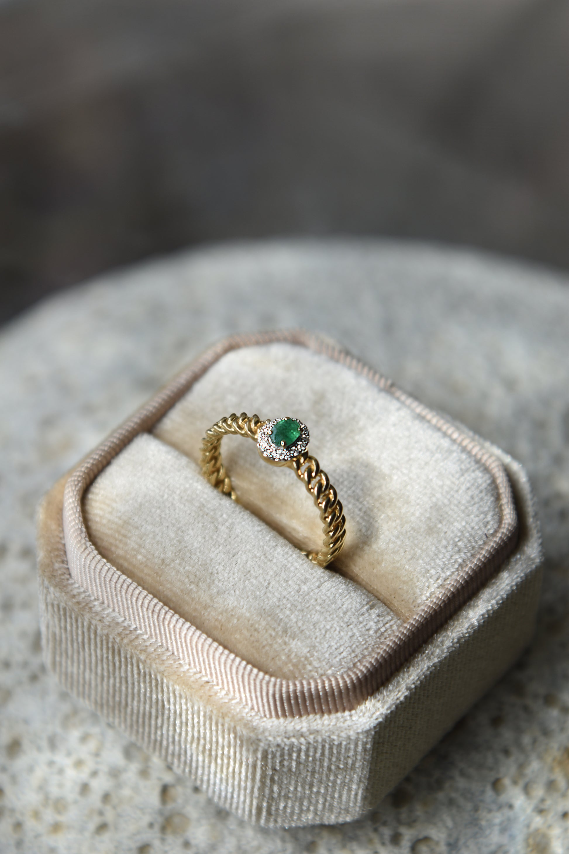 Anillo solitario halo, oro amarillo, esmeralda y brillantes