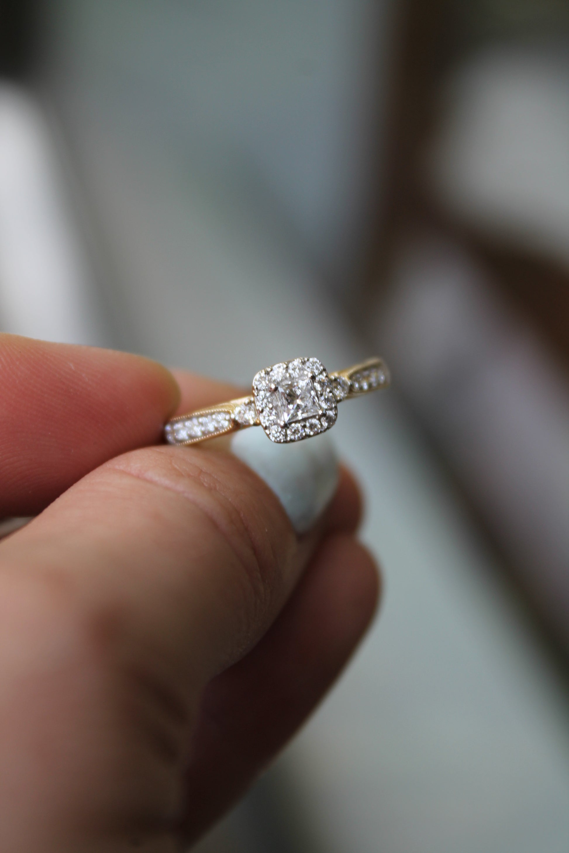 Anillo estilo antiguo, metal oro amarillo y diamantes de laboratorio