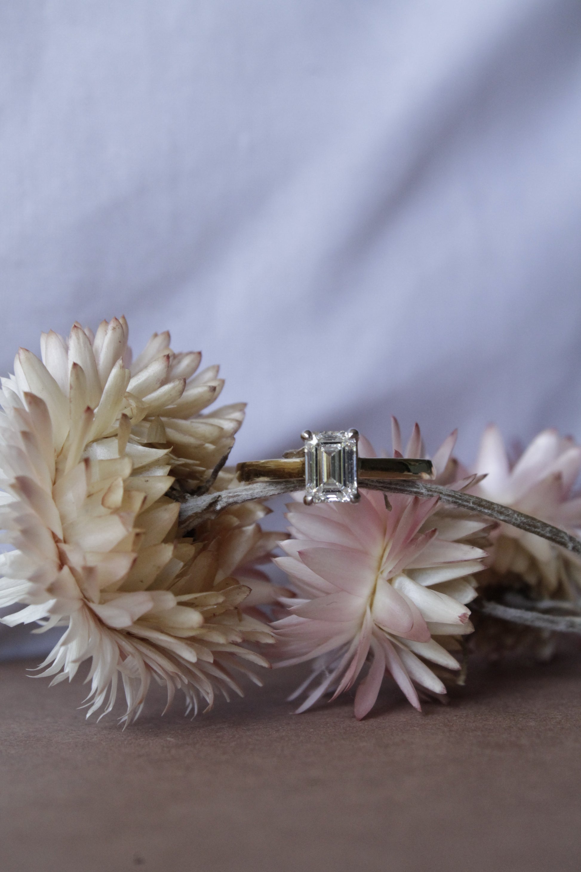 Anillo modelo solitario oro amarillo y diamante de laboratorio talla esmeralda