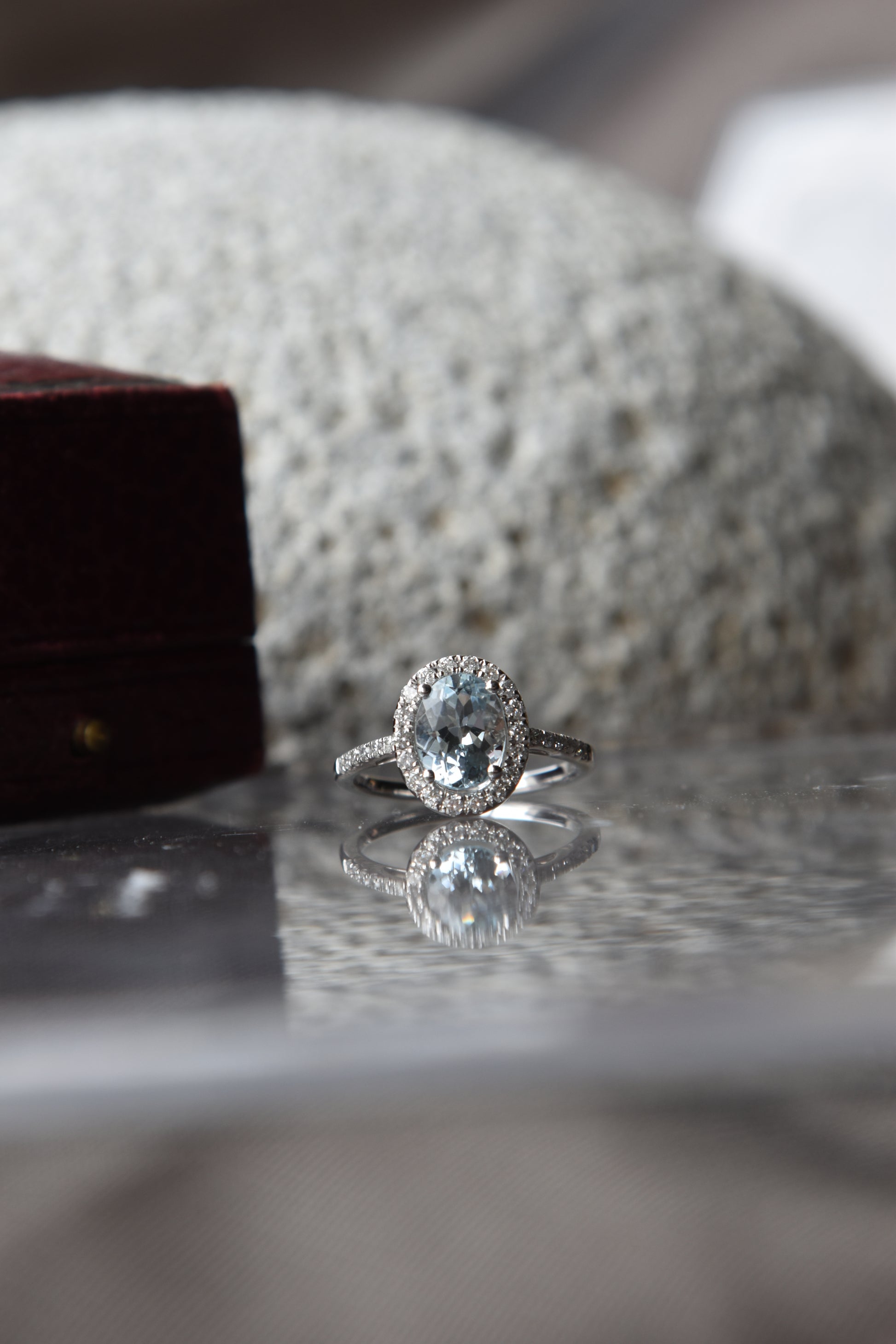 Anillo halo oval, metal oro blanco, aguamarina y brillantes