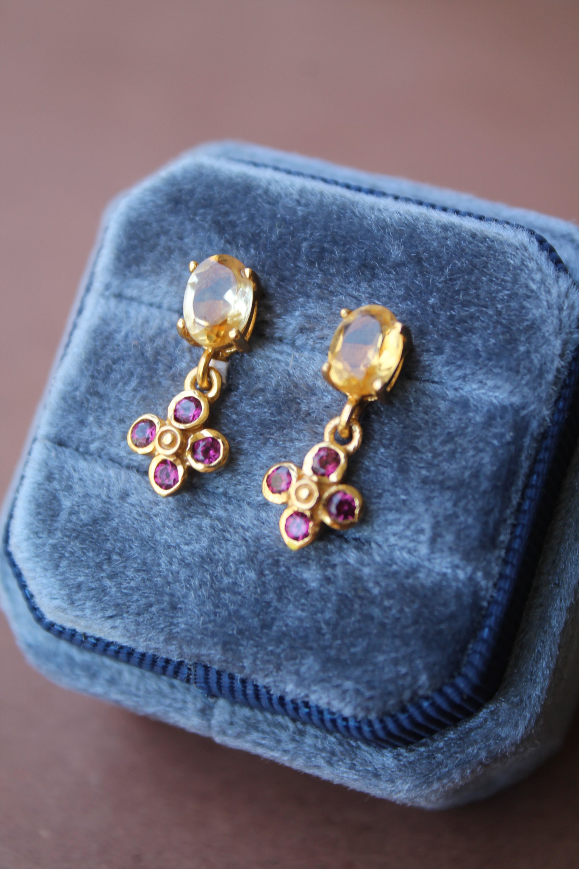 Aros metal plata 925 enchapada en oro, cuarzo citrino y granates