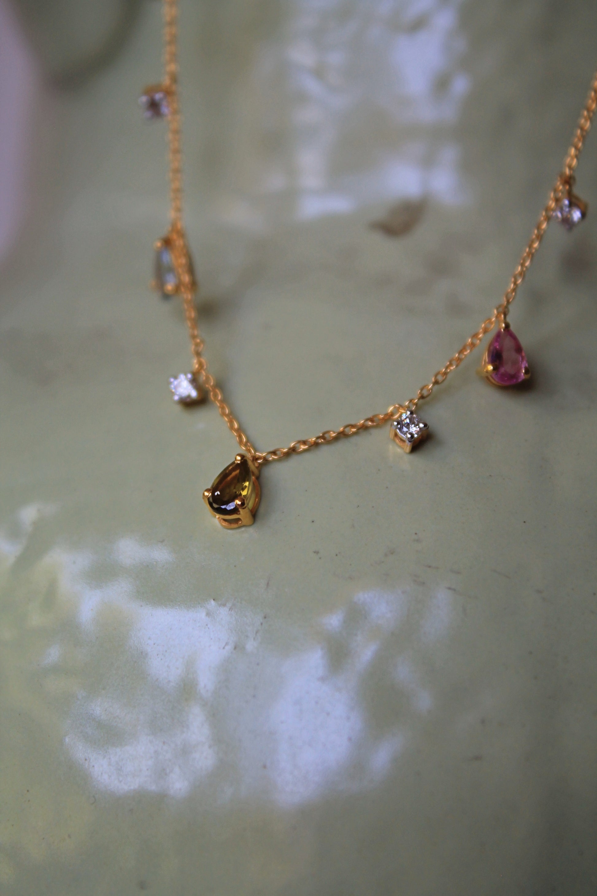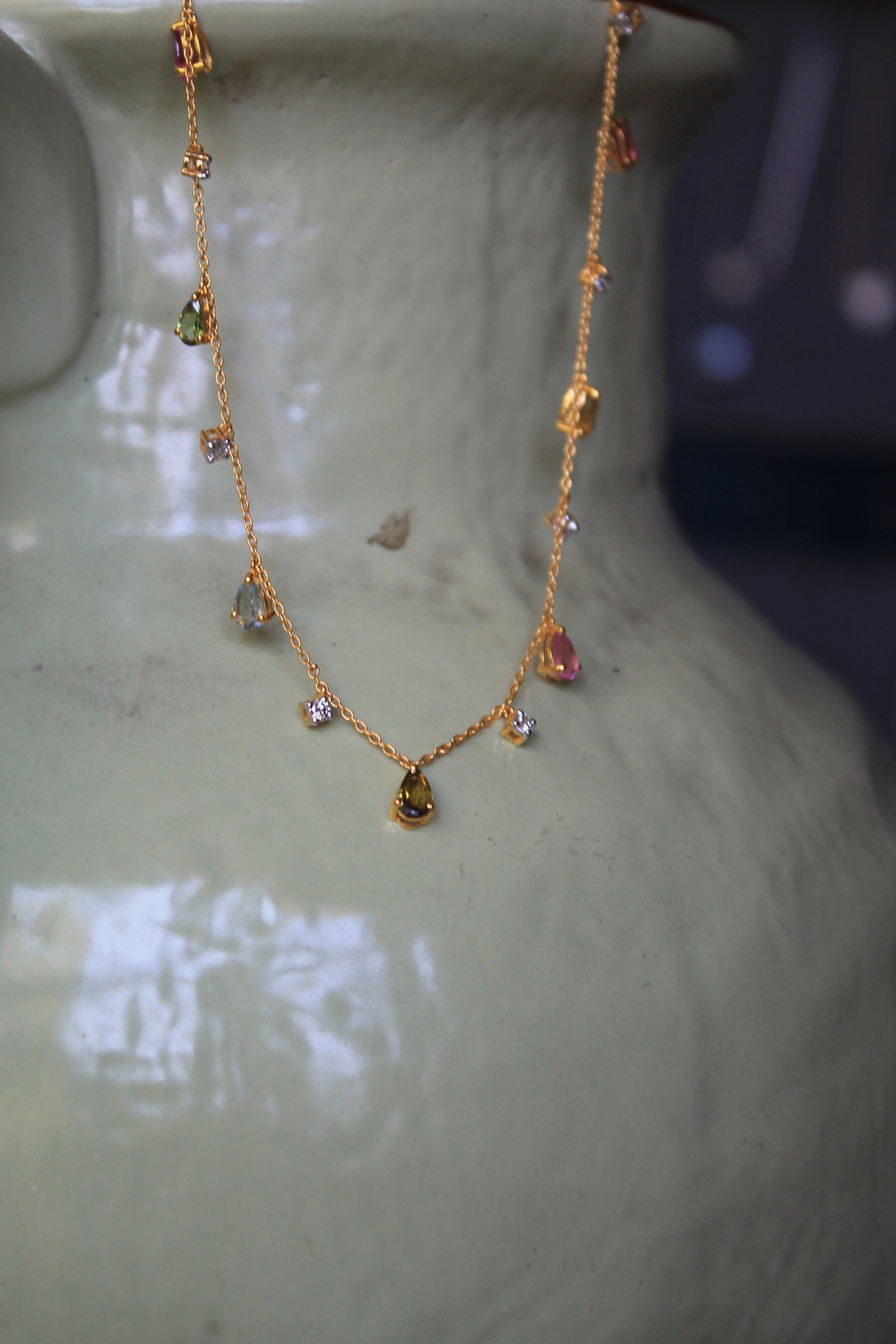 Collar borlas de oro amarillo, turmalina y brillantes.